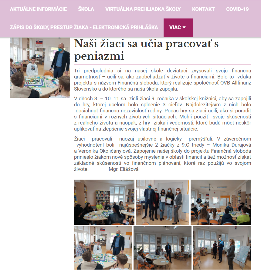 ,,Zapojenie našej školy do projektu Finančná sloboda prinieslo žiakom nové spôsoby myslenia v oblasti financií a tiež možnosť získať základné skúsenosti vo finančnom plánovaní, ktoré raz použijú vo svojom živote.“ – aj toto o nás napísali v článku na oficiálnej stránke školy