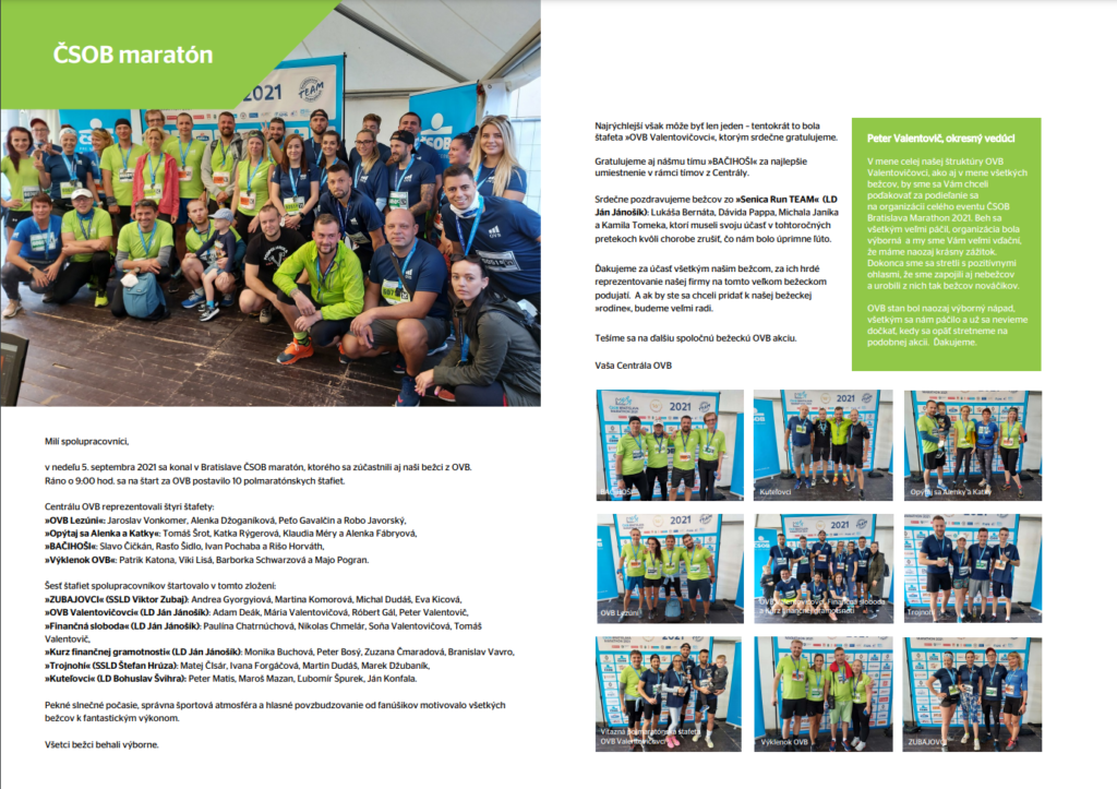 V súvislosti s ČSOB Bratislava Marathon 2021 vyšiel článok na centrále OVB, kde sa spomínajú všetky tímy zúčastnené na behu pod menom OVB. No a medzi nimi sme sa nachádzali aj my. v rámci centrály sme sa umiestnili na prvom mieste, dostali sme ocenenie ale najhlavnejšie je, že sme si odniesli pekný zážitok.